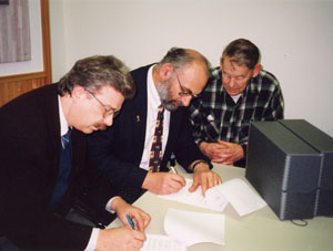 Mission, 9 January 1997. "Mr. Whonnock," Brian Byrnes looked on as Allan Springman, (Whonnock Community Association), centre, and Glen Kask (Mission Historical Society) signed an agreement to keep the historic records collected by the Whonnock Community in the Mission Community Archives.
